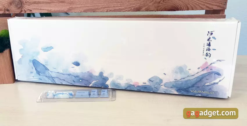 Das Varmilo VA108M Sea Melody ist in einer Schachtel in der gleichen Farbe wie das Keyboard selbst verpackt. In diesem Fall - die blau-weiße Schachtel mit dem Firmenlogo und nautischen Motiven. In der Box - die Tastatur selbst, zusätzliche Tastenkappen, Werkzeug zum Entfernen der Tastenkappen, abnehmbares Kabel, Dokumentation und der ungewöhnliche Bonus - ein Satz von Postkarten.