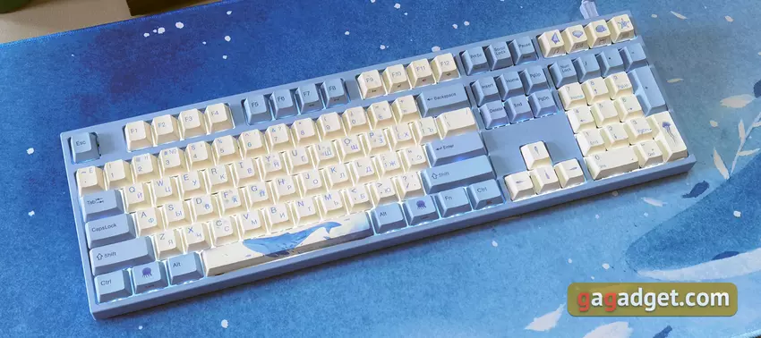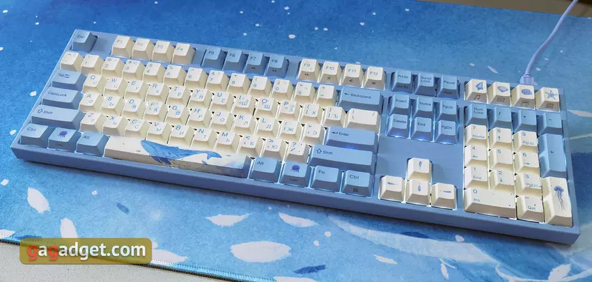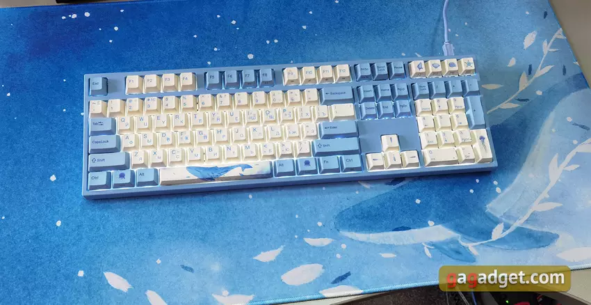 Die Tastatur hat keine weiteren Zusatzfunktionen. Daher ist es nicht erforderlich, eine zusätzliche Anwendung zu installieren. Einfach an einen USB-Anschluss anschließen und verwenden. Zusammen mit der Tastatur erhielten wir die Varmilo Sea Melody Desk Mat XL Oberfläche, die das gleiche Design wie die Tastatur hat. Die blau-weiße Farbgebung und das Bild eines Wals. XL ist die größte Variante und nimmt den meisten Platz aller Standard-Bürotische ein. Seine Abmessungen sind 900x400mm und 3mm dick. Es gibt auch kleinere Versionen.