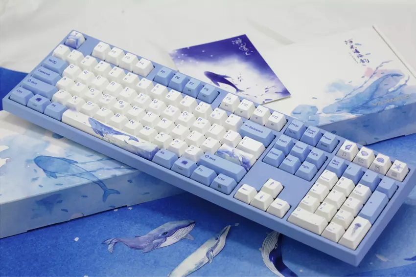 Die Varmilo VA108M Sea Melody ist strukturell eine typische klassische mechanische Tastatur. Im Gegensatz zu den inzwischen beliebten "Skelett-Tastaturen" ist die Tastatur mit einer Kunststoffabdeckung versehen, so dass die mechanischen Schalter für den Benutzer nicht sichtbar sind. Sie werden direkt auf einen Metallsockel montiert. Aber das Design der Tastatur ist sehr ungewöhnlich. Die Tasten sind weiß und blau und einige von ihnen sind mit Motiven aus dem Meer versehen, die von Tropfen über Quallen bis hin zu Muscheln, Seesternen und Walen reichen. Das Design ist ein wenig aufdringlich, aber keineswegs langweilig. Dasselbe Modell ist auch in anderen, "neutraleren" Versionen erhältlich.