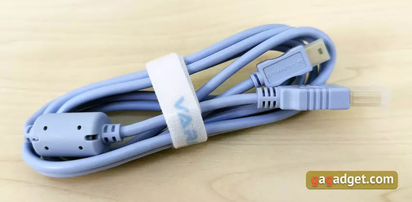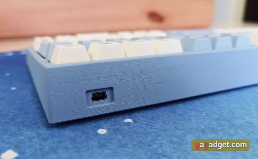 Auf der Rückseite der Tastatur befindet sich nur der Kabelanschluss näher am rechten Rand. Das abnehmbare Kabel ist großartig - es kann im Falle einer Störung einfach durch ein neues ersetzt werden. Aber die Verwendung des alten MiniUSB im Jahr 2021 ist ein wenig verwirrend. Es ist bequemer und, was noch wichtiger ist, es wäre wünschenswert, das heute weit verbreitete Typ-C-Kabel zu verwenden.