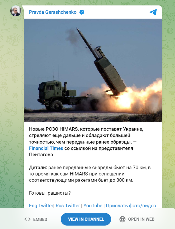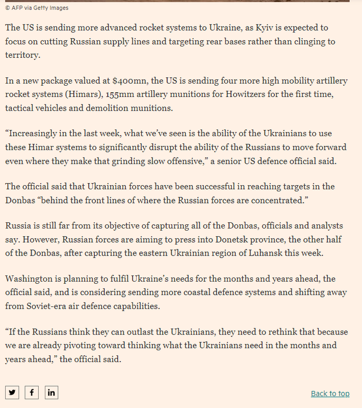 Trukha schreibt, dass die USA der Ukraine HIMARS-Raketen mit einer Reichweite von 300 km liefern. Die Financial Times wird mit den Worten zitiert. Dies wird von einer geringen Anzahl anderer Medien und Quellen berichtet.