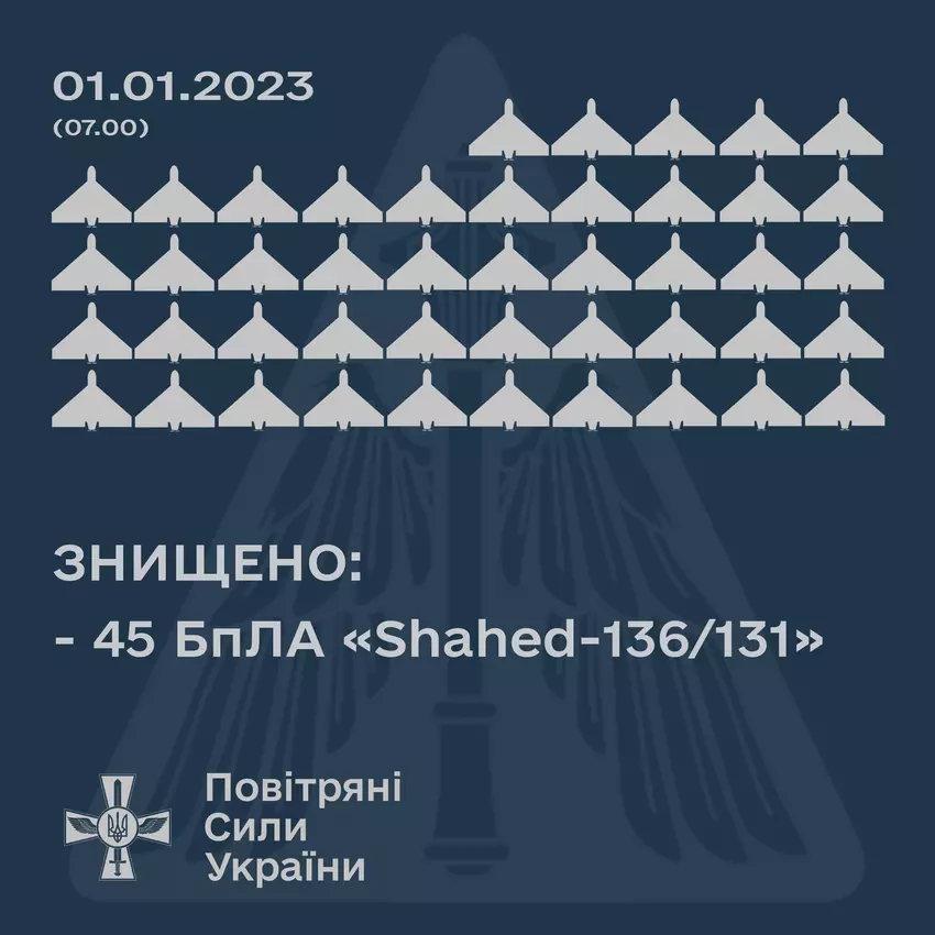 Nach Angaben des Luftwaffenkommandos der ukrainischen Streitkräfte konnten die Kampfeinheiten der Luftverteidigung 45 Drohnen mit einer Einbahnstraße zerstören. Wie viele insgesamt abgeschossen wurden, ist nicht bekannt.